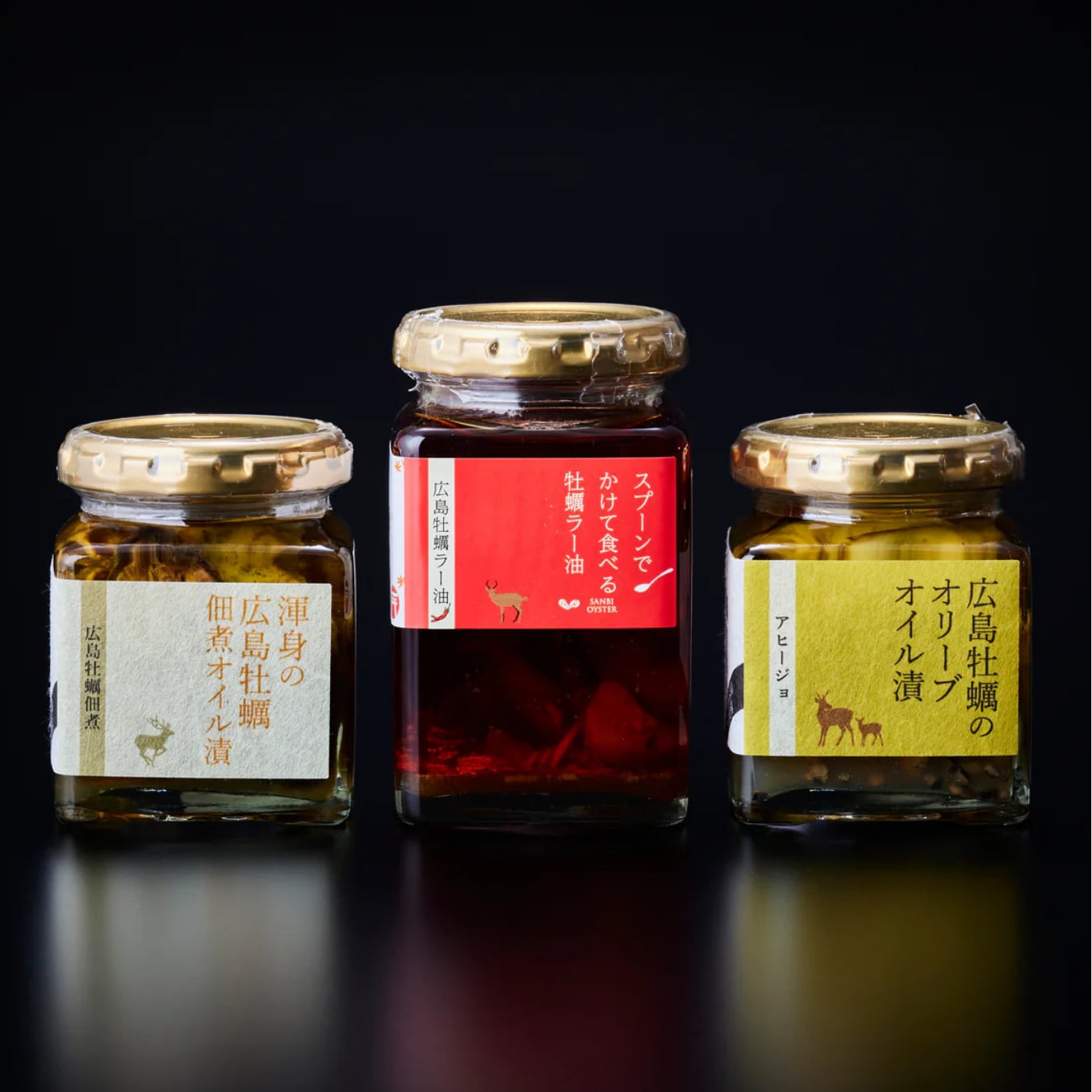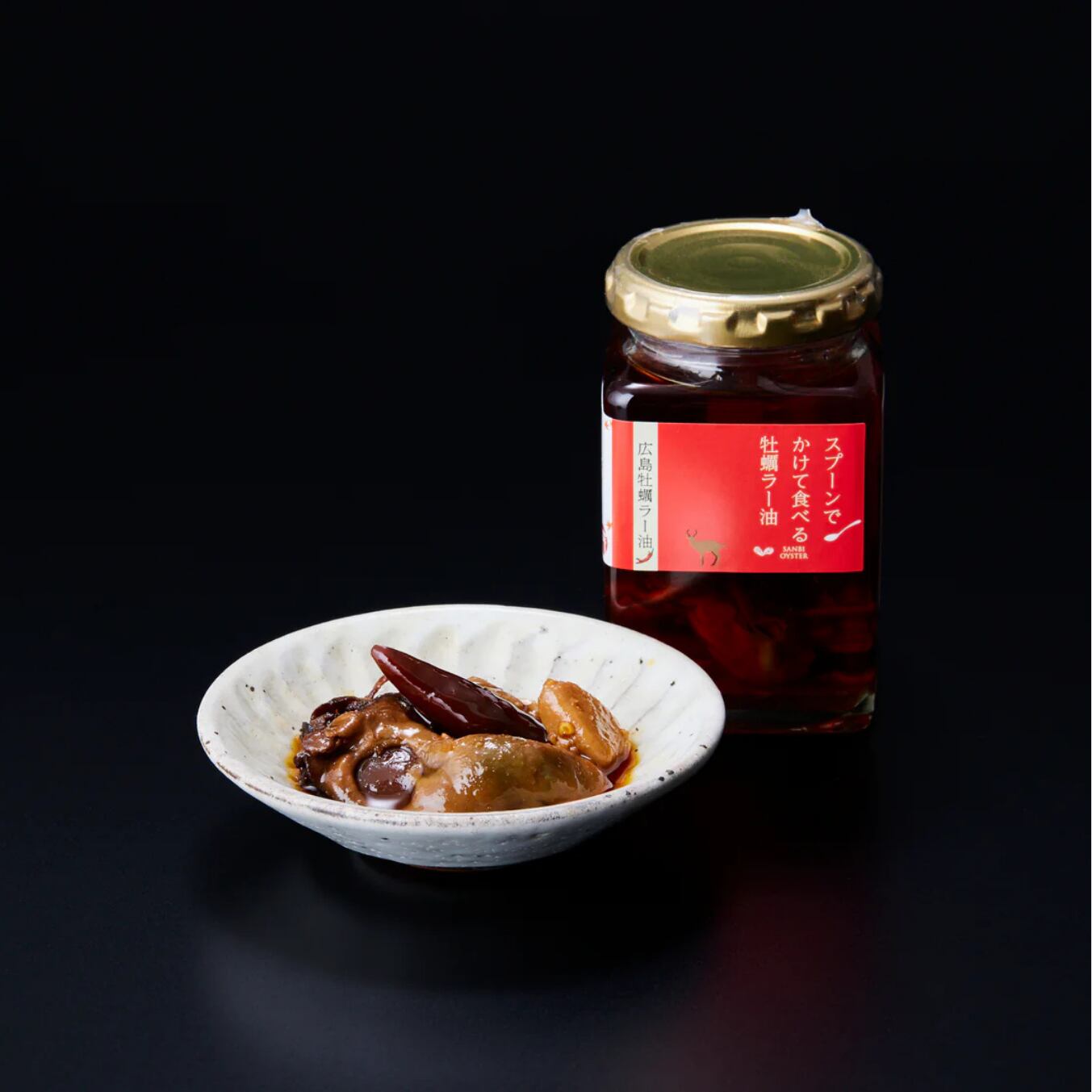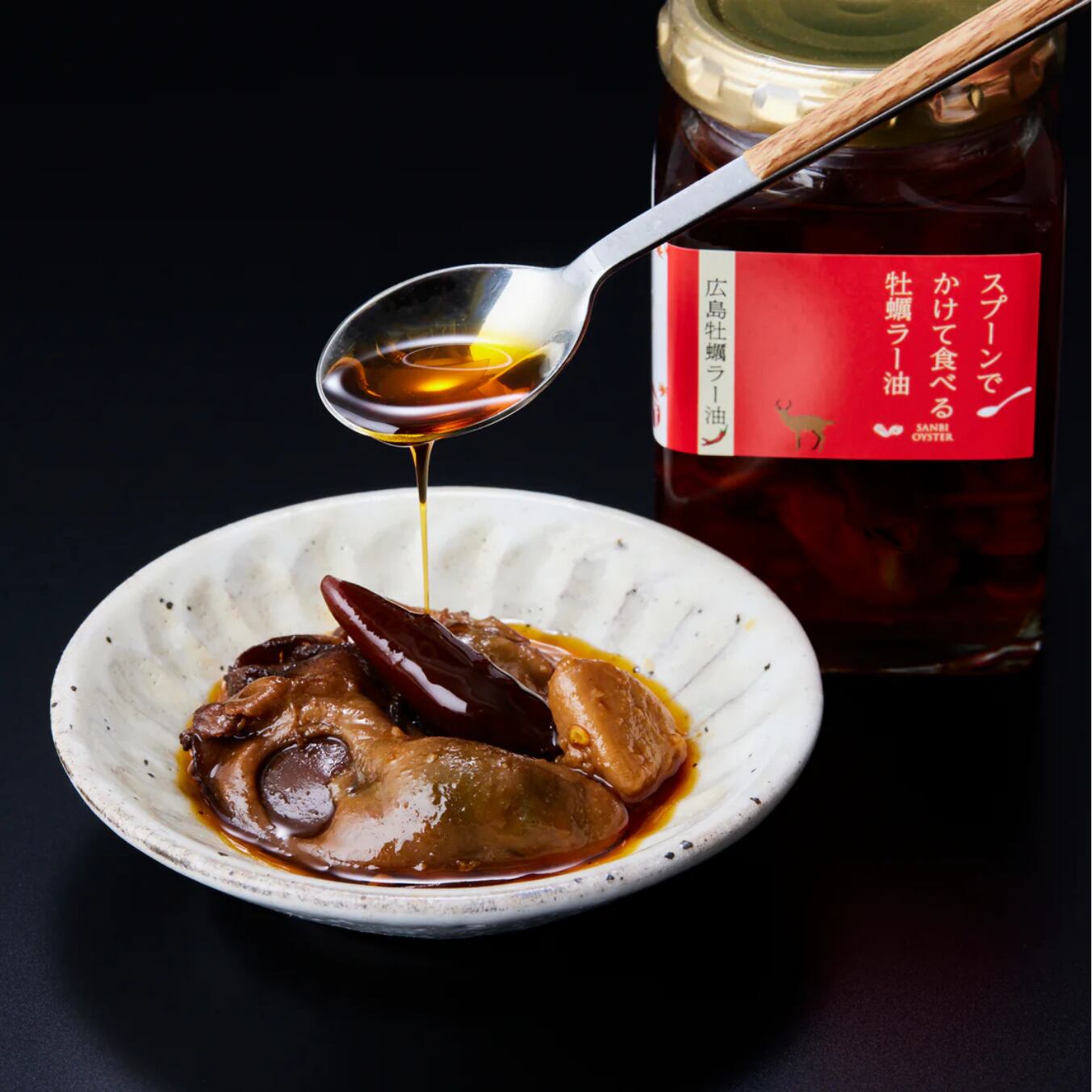 唐辛子、ねぎ、生姜、桂皮、八角を絶妙なバランスでブレンドした特製ラー油に、炙りさらに干すことで旨みを凝縮した牡蠣をいれたラー油。讃美牡蠣でしか手に入らないオリジナル商品。